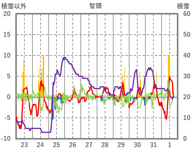 | 日 | 時 | 気温 | 降水 | 風向/風速 | 日照 | 積雪 | 降雪 |