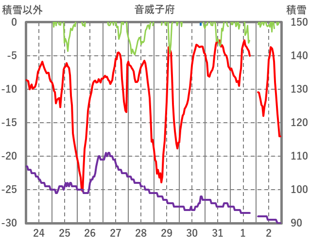 | 日 | 時 | 気温 | 降水 | 風向/風速 | 日照 | 積雪 | 降雪 |