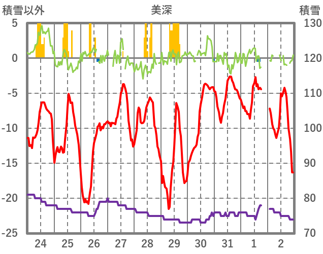 | 日 | 時 | 気温 | 降水 | 風向/風速 | 日照 | 積雪 | 降雪 |