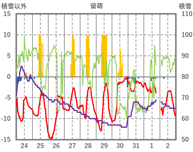 | 日 | 時 | 気温 | 降水 | 風向/風速 | 日照 | 積雪 | 降雪 |