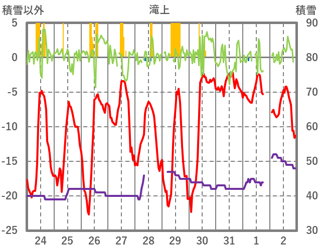 | 日 | 時 | 気温 | 降水 | 風向/風速 | 日照 | 積雪 | 降雪 |