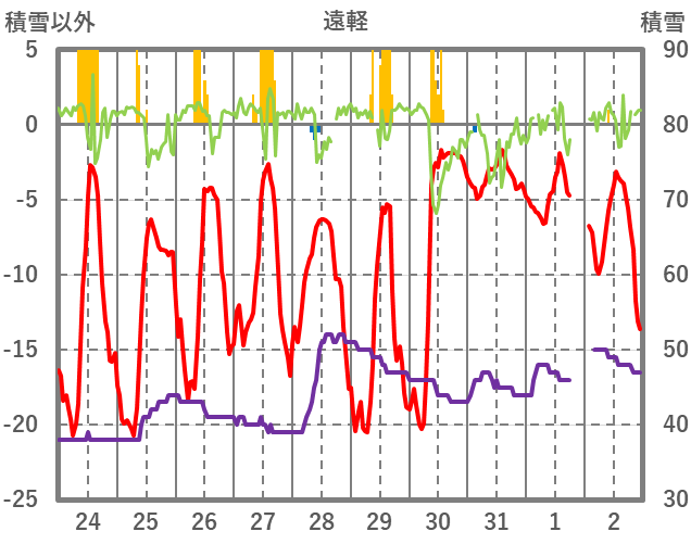 | 日 | 時 | 気温 | 降水 | 風向/風速 | 日照 | 積雪 | 降雪 |