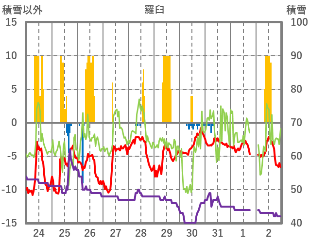 | 日 | 時 | 気温 | 降水 | 風向/風速 | 日照 | 積雪 | 降雪 |