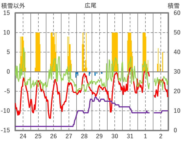 | 日 | 時 | 気温 | 降水 | 風向/風速 | 日照 | 積雪 | 降雪 |