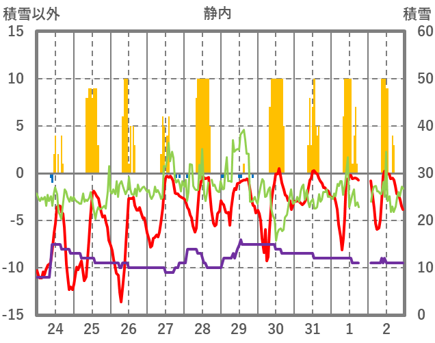 | 日 | 時 | 気温 | 降水 | 風向/風速 | 日照 | 積雪 | 降雪 |