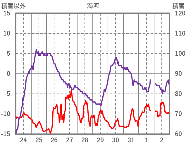 | 日 | 時 | 気温 | 降水 | 風向/風速 | 日照 | 積雪 | 降雪 |