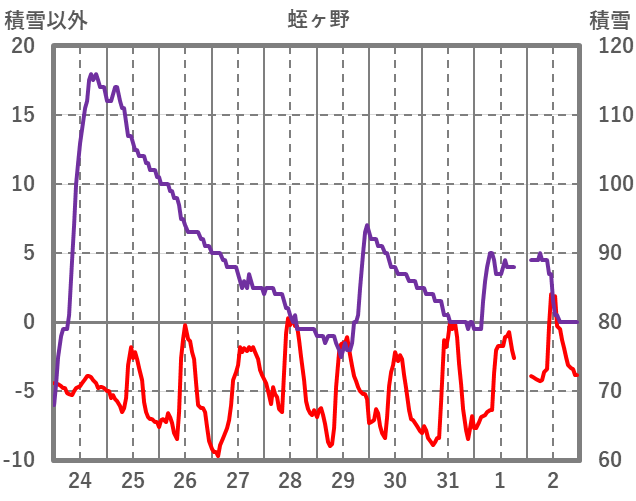 | 日 | 時 | 気温 | 降水 | 風向/風速 | 日照 | 積雪 | 降雪 |