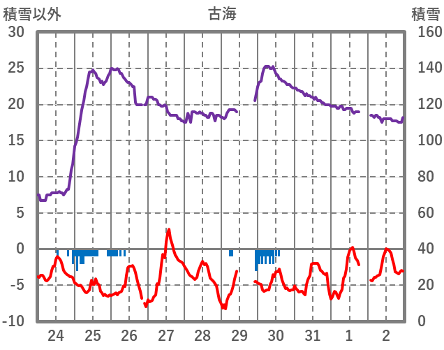 | 日 | 時 | 気温 | 降水 | 風向/風速 | 日照 | 積雪 | 降雪 |