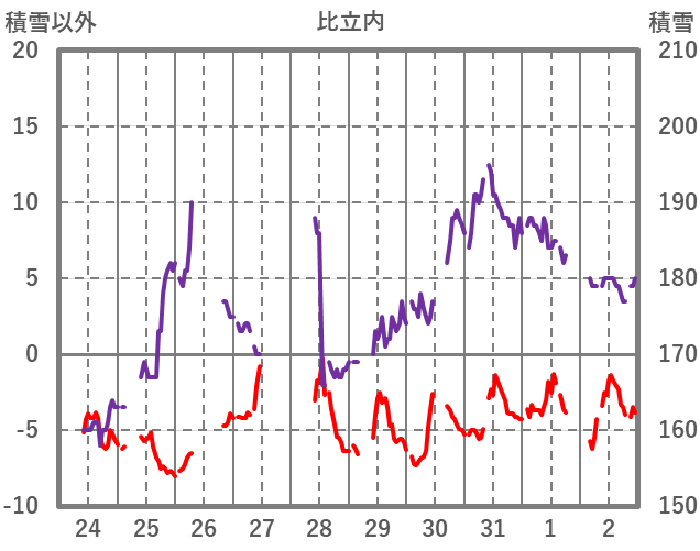 | 日 | 時 | 気温 | 降水 | 風向/風速 | 日照 | 積雪 | 降雪 |