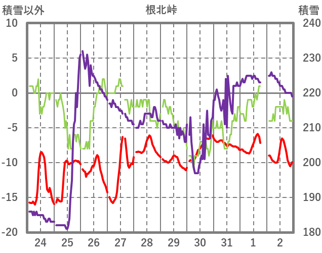 | 日 | 時 | 気温 | 降水 | 風向/風速 | 日照 | 積雪 | 降雪 |
