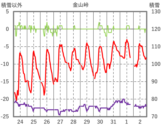 | 日 | 時 | 気温 | 降水 | 風向/風速 | 日照 | 積雪 | 降雪 |