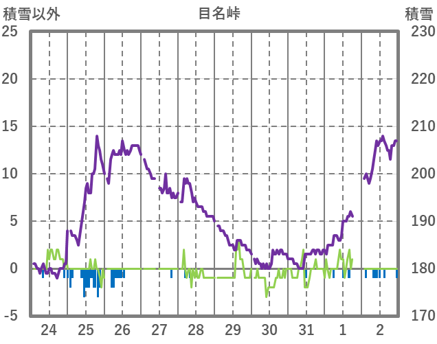 | 日 | 時 | 気温 | 降水 | 風向/風速 | 日照 | 積雪 | 降雪 |