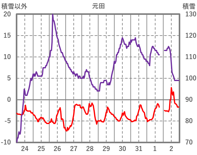| 日 | 時 | 気温 | 降水 | 風向/風速 | 日照 | 積雪 | 降雪 |