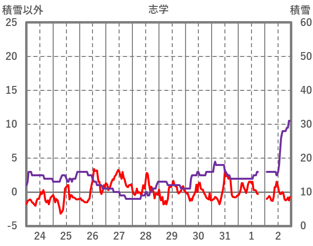 | 日 | 時 | 気温 | 降水 | 風向/風速 | 日照 | 積雪 | 降雪 |