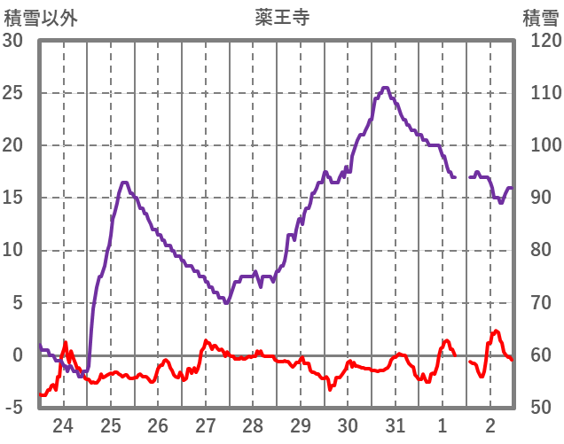 | 日 | 時 | 気温 | 降水 | 風向/風速 | 日照 | 積雪 | 降雪 |