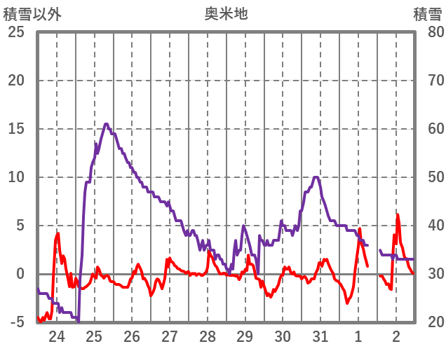 | 日 | 時 | 気温 | 降水 | 風向/風速 | 日照 | 積雪 | 降雪 |