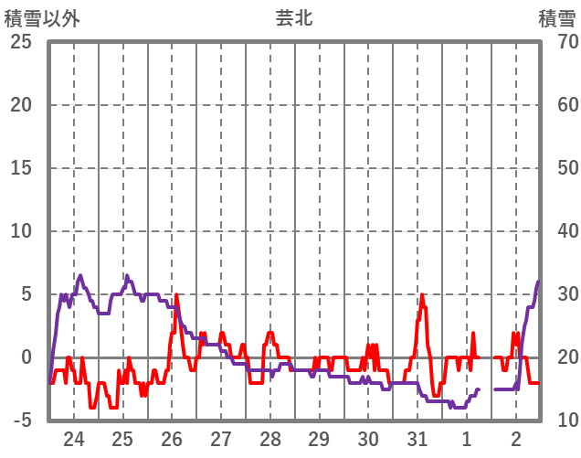 | 日 | 時 | 気温 | 降水 | 風向/風速 | 日照 | 積雪 | 降雪 |