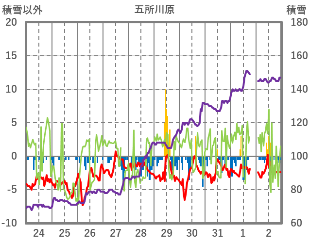 | 日 | 時 | 気温 | 降水 | 風向/風速 | 日照 | 積雪 | 降雪 |