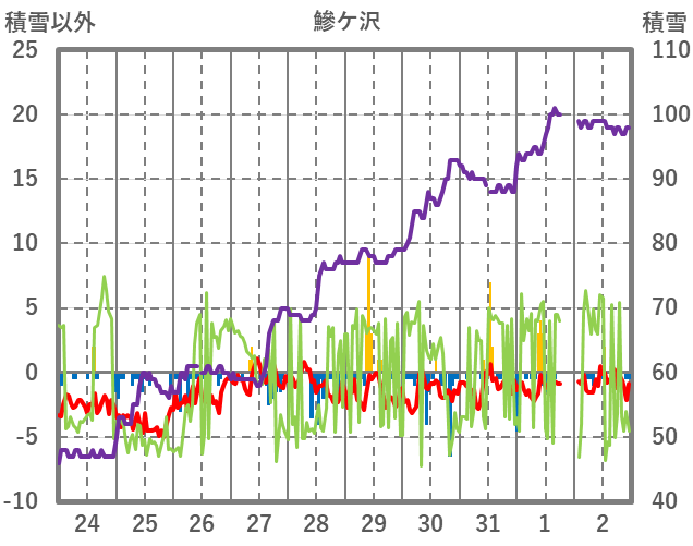 | 日 | 時 | 気温 | 降水 | 風向/風速 | 日照 | 積雪 | 降雪 |