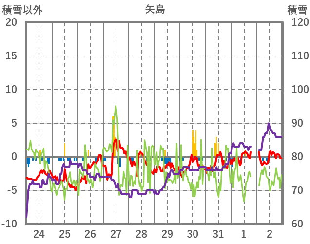 | 日 | 時 | 気温 | 降水 | 風向/風速 | 日照 | 積雪 | 降雪 |