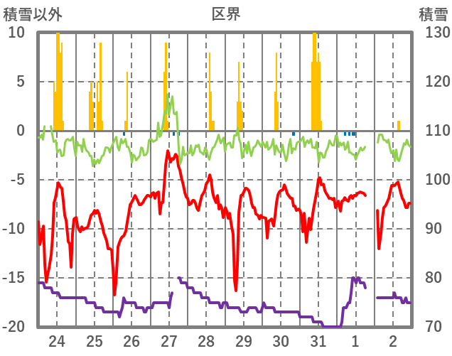 | 日 | 時 | 気温 | 降水 | 風向/風速 | 日照 | 積雪 | 降雪 |