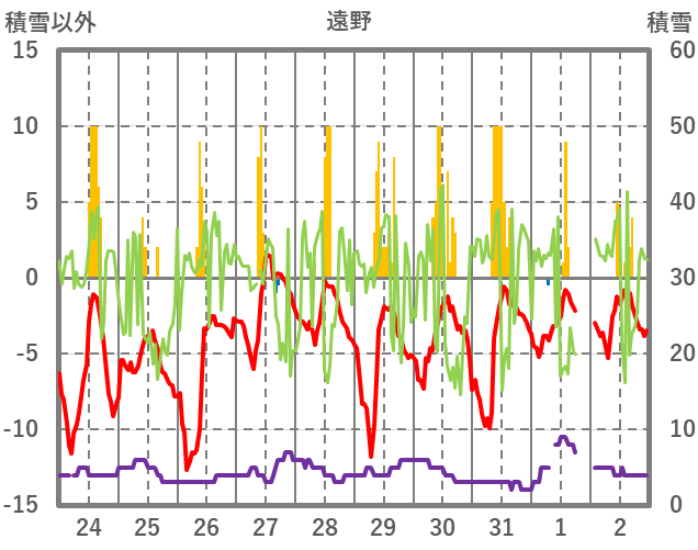 | 日 | 時 | 気温 | 降水 | 風向/風速 | 日照 | 積雪 | 降雪 |