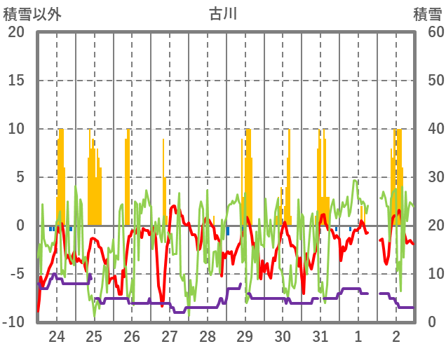 | 日 | 時 | 気温 | 降水 | 風向/風速 | 日照 | 積雪 | 降雪 |