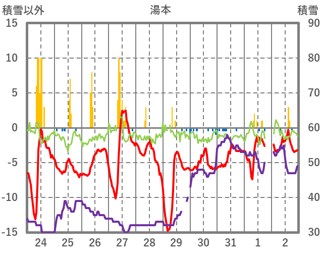 | 日 | 時 | 気温 | 降水 | 風向/風速 | 日照 | 積雪 | 降雪 |