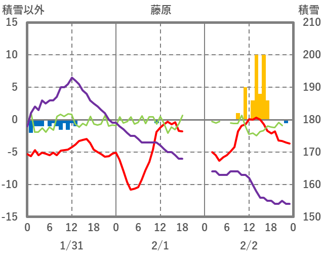 | 日 | 時 | 気温 | 降水 | 風向/風速 | 日照 | 積雪 | 降雪 |