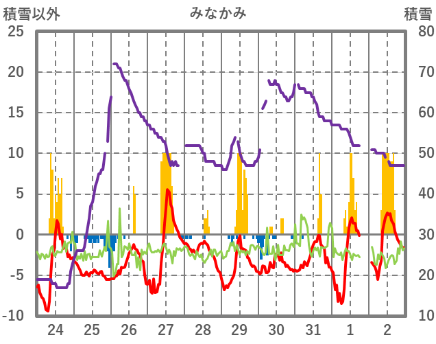 | 日 | 時 | 気温 | 降水 | 風向/風速 | 日照 | 積雪 | 降雪 |