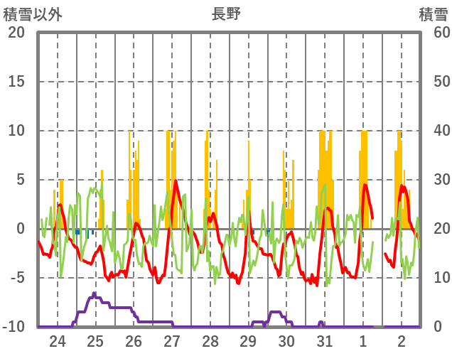 | 日 | 時 | 気温 | 降水 | 風向/風速 | 日照 | 積雪 | 降雪 |