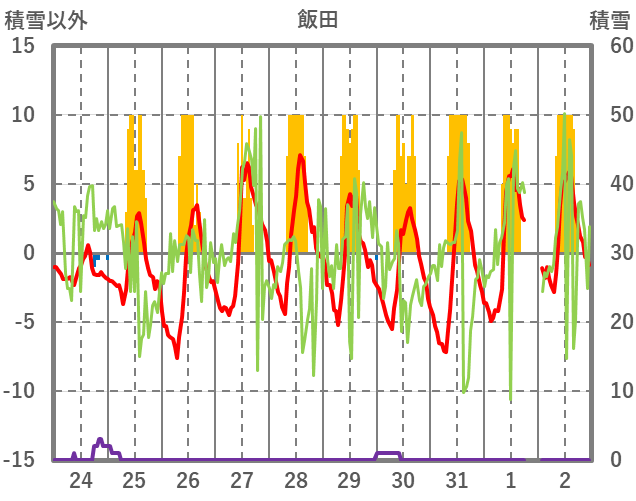 | 日 | 時 | 気温 | 降水 | 風向/風速 | 日照 | 積雪 | 降雪 |