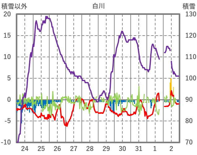 | 日 | 時 | 気温 | 降水 | 風向/風速 | 日照 | 積雪 | 降雪 |
