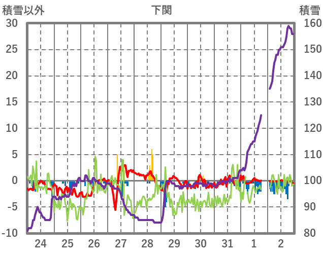 | 日 | 時 | 気温 | 降水 | 風向/風速 | 日照 | 積雪 | 降雪 |