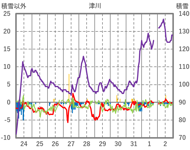 | 日 | 時 | 気温 | 降水 | 風向/風速 | 日照 | 積雪 | 降雪 |