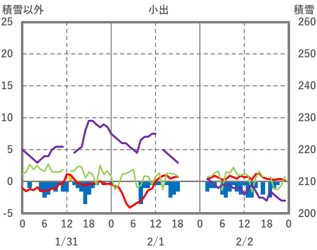 | 日 | 時 | 気温 | 降水 | 風向/風速 | 日照 | 積雪 | 降雪 |