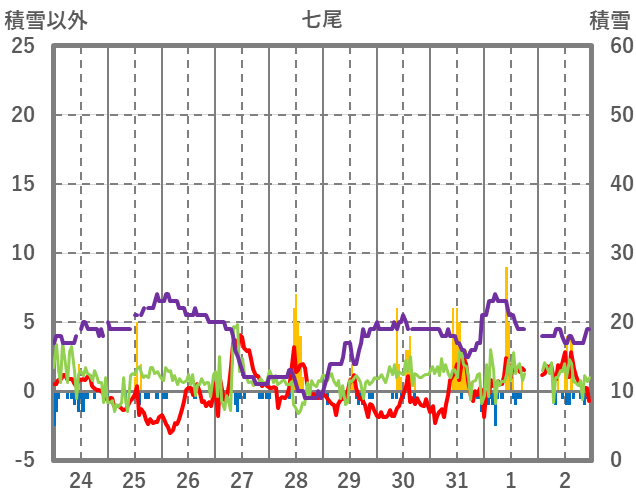 | 日 | 時 | 気温 | 降水 | 風向/風速 | 日照 | 積雪 | 降雪 |