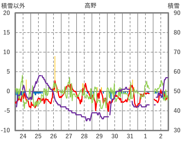 | 日 | 時 | 気温 | 降水 | 風向/風速 | 日照 | 積雪 | 降雪 |