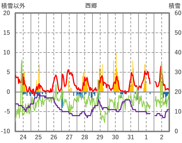 | 日 | 時 | 気温 | 降水 | 風向/風速 | 日照 | 積雪 | 降雪 |