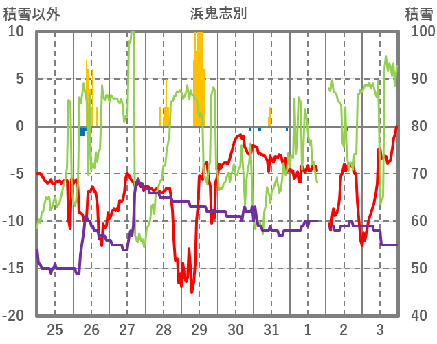 | 日 | 時 | 気温 | 降水 | 風向/風速 | 日照 | 積雪 | 降雪 |