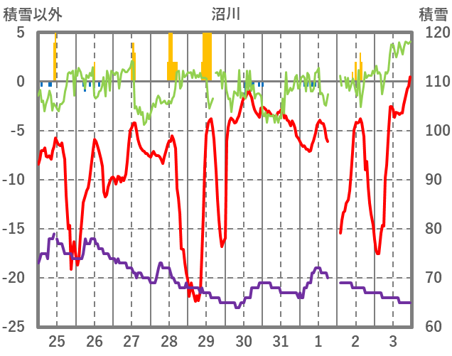| 日 | 時 | 気温 | 降水 | 風向/風速 | 日照 | 積雪 | 降雪 |
