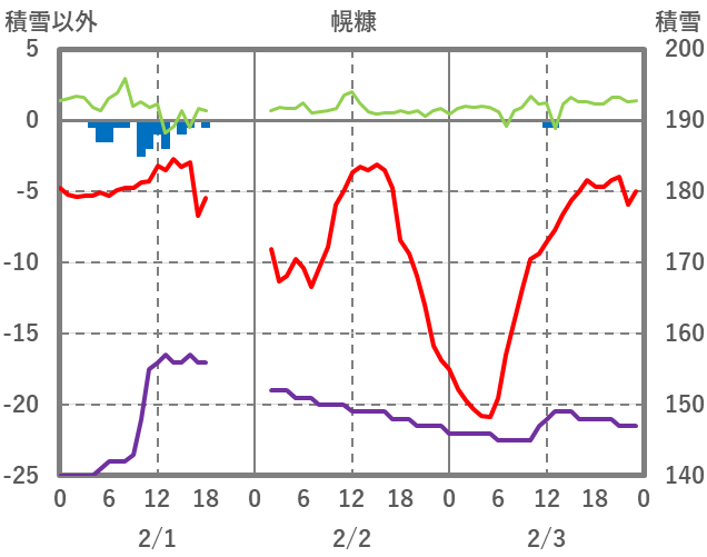 | 日 | 時 | 気温 | 降水 | 風向/風速 | 日照 | 積雪 | 降雪 |