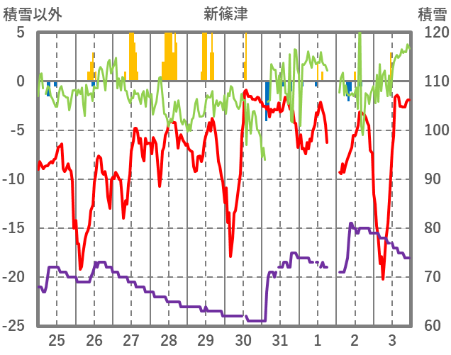 | 日 | 時 | 気温 | 降水 | 風向/風速 | 日照 | 積雪 | 降雪 |