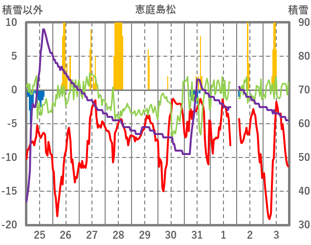 | 日 | 時 | 気温 | 降水 | 風向/風速 | 日照 | 積雪 | 降雪 |