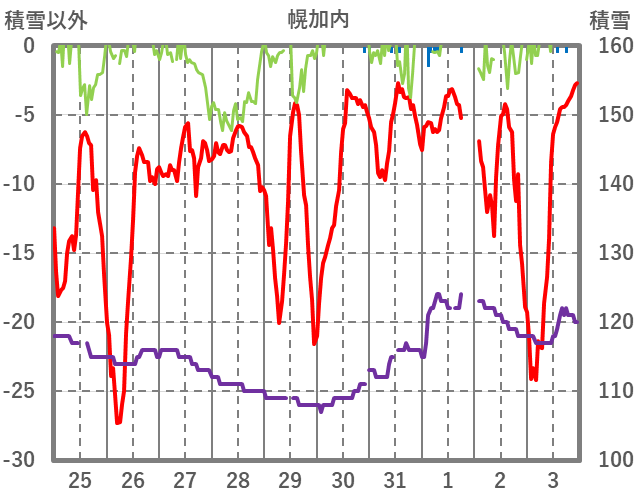 | 日 | 時 | 気温 | 降水 | 風向/風速 | 日照 | 積雪 | 降雪 |