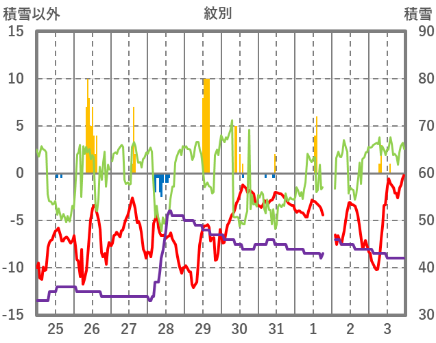 | 日 | 時 | 気温 | 降水 | 風向/風速 | 日照 | 積雪 | 降雪 |