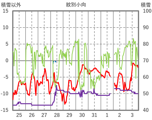 | 日 | 時 | 気温 | 降水 | 風向/風速 | 日照 | 積雪 | 降雪 |