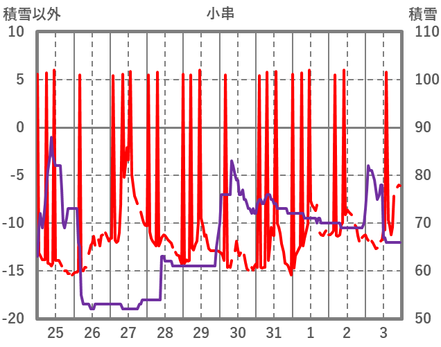 | 日 | 時 | 気温 | 降水 | 風向/風速 | 日照 | 積雪 | 降雪 |