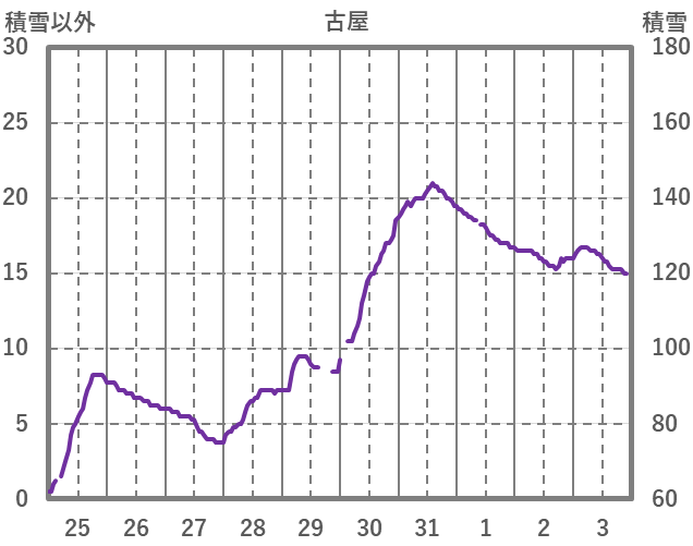 | 日 | 時 | 気温 | 降水 | 風向/風速 | 日照 | 積雪 | 降雪 |