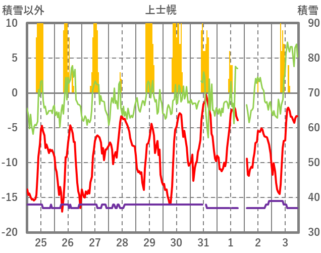| 日 | 時 | 気温 | 降水 | 風向/風速 | 日照 | 積雪 | 降雪 |